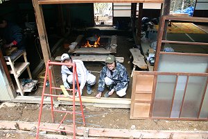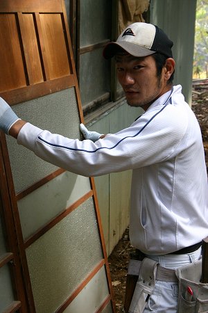 | 戸の取り付けをする、山梨の大工、平井さんと、風間さん。 |