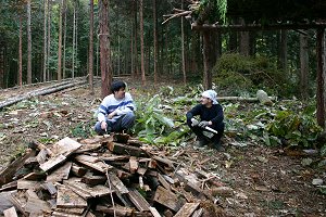 鉈で枝打ち。 |